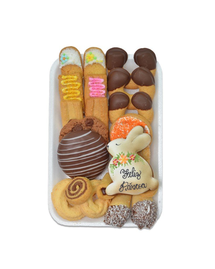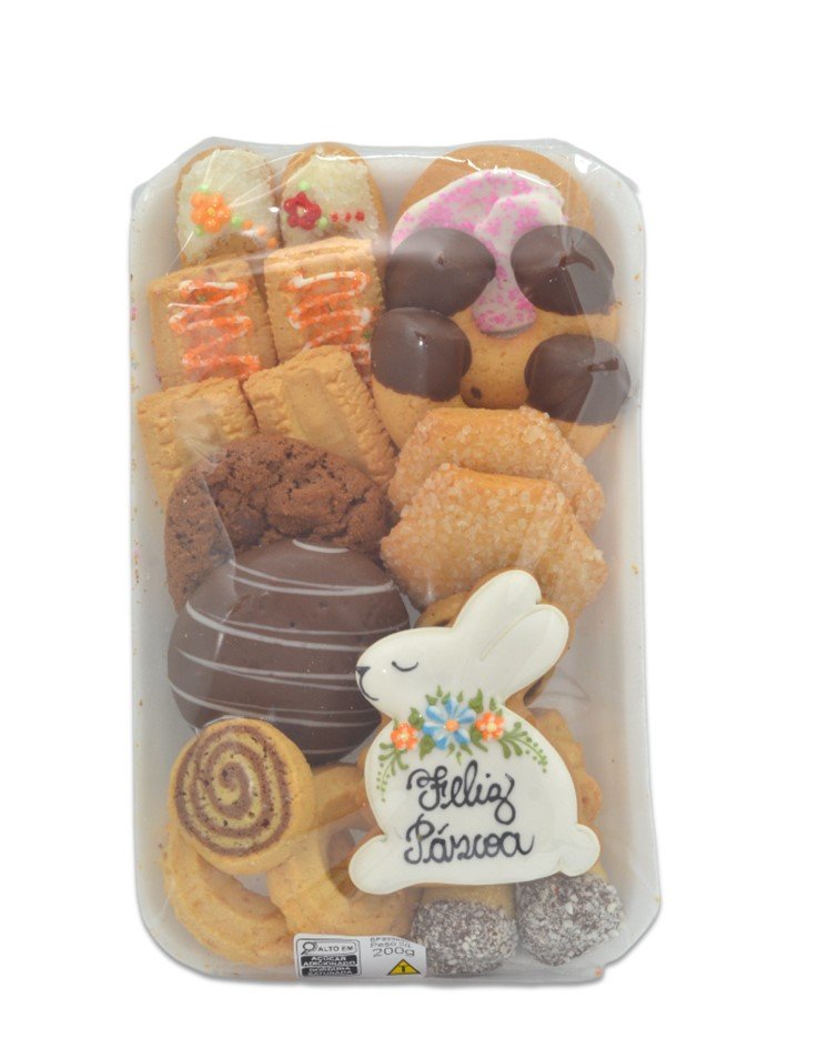Spritz decorado (Biscoito amanteigado) - Ingredientes: Farinha de trigo enriquecida com ferro e ácido fólico, açúcar, manteiga, ovo, gordura vegetal (óleo de palma, óleo de soja*, estearina de palma e antioxidante: buti-hidroxitolueno BHT (INS 321), amido de milho*, fécula de mandioca, açúcar baunilha (açúcar e aroma de baunilha. "Aromatizado artificialmente"), sal, essência de baunilha (base aromática artificial de baunilha diluída em água e álcool etílico neutro), e fermento químico bicarbonato de amônio (INS 503ii). Ingredientes da cobertura: açúcar colorido (açúcar e corante artificial amarelo (tartrazina e amarelo crepúsculo FCF) ou azul (azul brilhante FCF) ou rosa (corante artificial eritrosina) ou verde (tartrazina e azul brilhante FCF) ou vermelho (vermelho 40 e eritrosina)), miçanga colorida (açúcar, amido de milho*, amido modificado, glucose de milho, antiumectante carbonato de cálcio, glaceante cera de carnaúba e corantes artificiais vermelho 40, tartrazina e azul brilhante FCF) e glacê (açúcar, clara de ovo, vinagre e açúcar baunilha (açúcar e aroma de baunilha. "Aromatizado artificialmente")). *Geneticamente modificados a partir do Agrobacterium tumefaciens e/ou Bacillus thuringiensis e/ou Delftia acidovoran e/ou Stenotrophomonas maltophilia e /ou Sphingobium herbicidovorans e/ou Streptomyces viridochromogenes e/ou Zea mays. CONTÉM GLUTEN. CONTÉM LACTOSE. ALÉRGICOS: CONTEM TRIGO, OVOS, DERIVADOS DA SOJA E DO LEITE. PODE CONTER CENTEIO, CEVADA, AVEIA, AMENDOIM, SOJA, LEITE, AMÊNDOA, AVELÃS, CASTANHA-DE-CAJU, CASTANHA-DO-PARA, NOZES, PECÃS E CASTANHAS.