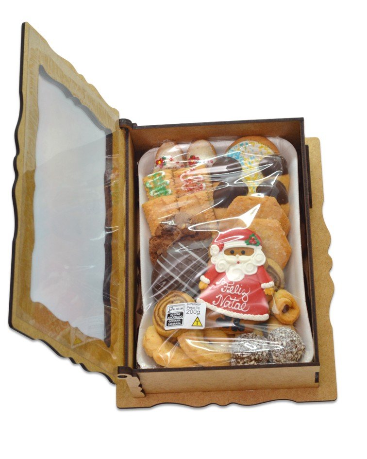 Bolacha de Mel Decorada (Bolacha com recheio de mel) - Ingredientes: Farinha de trigo enriquecida com ferro e ácido fólico, açúcar de confeiteiro (açúcar refinado e amido de milho), açúcar, mel, ovo, clara de ovo, margarina 80% lipídios (óleos e gorduras vegetais totalmente hidrogenadas e interesterificadas, água, sal hipossódico, creme de leite, emulsificante: mono e diglicerídeos de ácidos graxos, lecitina de soja e poliglicerol polirricinoleato, conservantes: sorbato de potássio, acidulante: ácido cítrico, aromatizante: aroma idêntico ao natural, antioxidantes: TBHQ e EDTA cálcico dissódico, corantes: urucum e cúrcuma, Bacillus thuringiensis, Streptomyces vitidochromogenes e Agrobacterium tumefaciens, Zea mays), açúcar impalpável (açúcar, amido de milho e fécula de mandioca), melado, bicarbonato de sódio (INS500ii), amido modificado, chocolate em pó, limão, sal amoníaco, açúcar de baunilha (açúcar e aromatizante), sal, noz moscada, sorbato de potássio (INS202), corantes artificiais vermelho 40 (INS129), tartrazina (INS102), dióxido de titânio (INS171), amarelo crepúsculo (INS110), azul brilhante FCF (INS133), óxido de ferro preto (INS171i), ponceau 4R (INS124), eritrosina (INS127), indigotina (INS132), metabissulfito de potássio (INS224), espessantes goma carragena (INS407) e goma jataí (INS 410). CONTEM GLÚTEN. CONTÉM LACTOSE. ALÉRGICOS: CONTÉM DERIVADOS DE SOJA E LEITE. PODE CONTER OVO E LEITE. COLORIDO ARTIFICIALMENTE.