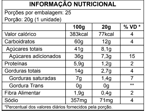 INGREDIENTES: Açúcar, massa de cacau, manteiga de cacau, açúcar demerara, gordura vegetal, leite desnatado em pó, permeado de soro de leite em pó, aroma natural de baunilha, farinha de trigo enriquecida com ferro e ácido fólico, mel, ovo, margarina 80% lipídios (óleos e gorduras vegetais totalmente hidrogenadas e interesterificadas, água, sal hipossódico, creme de leite, emulsificante: mono e diglicerídeos de ácidos graxos, lecitina de soja e poliglicerol polirricinoleato, conservantes: sorbato de potássio, acidulante: ácido cítrico, aromatizante: aroma idêntico ao natural, antioxidantes: TBHQ e EDTA cálcico dissódico, corantes: urucum e cúrcuma, Bacillus thuringiensis, Streptomyces vitidochromogenes e Agrobacterium tumefaciens), canela em pó, sal, propionato de cálcio, bicarbonado de amônia, bicarbonato de sódio (INS500ii), chocolate em pó, coentro em pó, pimenta dioica, propionato de cálcio, cravo da índia, noz moscada, anis estrelado em pó e gengibre em pó, emulsificantes lecitina de soja (INS322), estabilizantes ésteres de ácido ricinoléico interesterificado como poliglicerol (INS476), aromatizante, corantes vermelho 40 (INS129), tartrazina (INS102), dióxido de titânio (INS171), amarelo crepúsculo (INS110), azul brilhante fcf (INS133), óxido de ferro preto (INS171i), ponceau 4r (INS124), eritrosina (INS127), indigotina (INS132), metabissulfito de potássio (INS224) e espessantes goma carragena (INS407) e goma jataí (INS 410). CONTEM GLÚTEN. CONTÉM LACTOSE. ALÉRGICOS: CONTÉM OVO, DERIVADOS DE SOJA E LEITE. PODE CONTER TRIGO, CASTANHA DO PARÁ, CASTANHA DE CAJU, AVELÃ, AMÊNDOA, AMENDOIM, AVEIA, CEVADA, CENTEIO E LÁTEX.