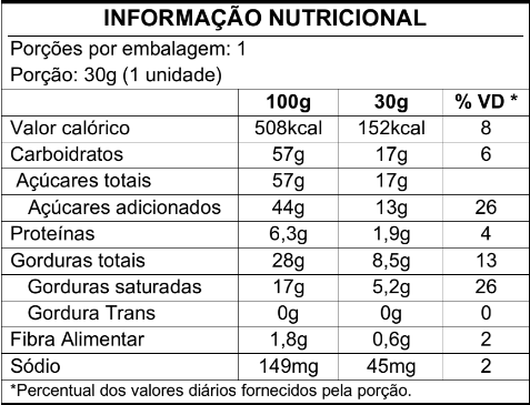 INGREDIENTES: Açúcar, massa de cacau, manteiga de cacau, açúcar demerara, gordura vegetal, leite em pó integral, leite desnatado em pó, permeado de soro de leite em pó, aroma natural de baunilha, emulsificantes lecitina de soja (INS 322), estabilizante ésteres de ácido ricinoléico interesterificado como poliglicerol (INS 476), aromatizante, nata (creme de leite pasteurizado e estabilizante carragena (INS407)), glucose de milho, sal e corantes vermelho 40 (INS129), tartrazina (INS102), dióxido de titânio (INS171), amarelo crepúsculo (INS110), azul brilhante fcf (INS133), óxido de ferro preto (INS171i), ponceau 4r (INS124), eritrosina (INS127), indigotina (INS132), metabissulfito de potássio (INS224) e espessantes goma carragena (INS407) e goma jataí (INS 410). CONTEM GLÚTEN. CONTÉM LACTOSE. CONTÉM AÇÚCAR. ALÉRGICOS: CONTÉM DERIVADOS DE SOJA. PODE CONTER LEITE E TRIGO. PODE CONTER AMENDOIM, AMÊNDOA, CASTANHA-DE-CAJU, CASTANHA-DO-PARÁ, AVELÃ, AVEIA, CEVADA, CENTEIO, TRIGO E LÁTEX NATURAL.