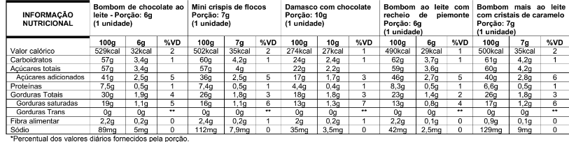 Bombom mesclado (Bombom de chocolate mesclado) - Ingredientes: Açúcar, massa de cacau, manteiga de cacau, açúcar demerara, gordura vegetal, leite em pó integral, leite desnatado em pó, soro de leite em pó, aroma natural de baunilha, emulsificantes lecitina de soja (INS 322), ésteres de ácido graxos com poliglicerol (INS 475), estabilizante ésteres de ácido ricinoléico interesterificado como poliglicerol (INS 476), aromatizante. CONTEM GLÚTEN. CONTÉM LACTOSE. CONTÉM AÇÚCAR. ALÉRGICOS: CONTÉM DERIVADOS DE LEITE E DE SOJA, PODE CONTER AMENDOIM, AMÊNDOA, CASTANHA-DE-CAJU, CASTANHA-DO-PARÁ, AVELÃ, AVEIA, CEVADA E TRIGO.