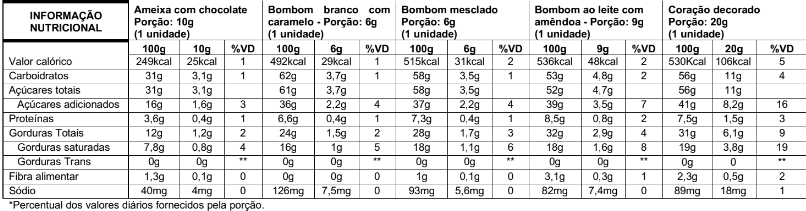Coração decorado (Chocolate ao leite e chocolate branco decorado) - Ingredientes: Açúcar, massa de cacau, manteiga de cacau, açúcar demerara, gordura vegetal, leite em pó integral, leite desnatado em pó, soro de leite em pó, aroma natural de baunilha, emulsificantes lecitina de soja (INS 322), ésteres de ácido graxos com poliglicerol (INS 475), estabilizante ésteres de ácido ricinoléico interesterificado como poliglicerol (INS 476), corantes artificiais vermelho 40 (INS129), tartrazina (INS102), dióxido de titânio (INS171), amarelo crepúsculo (INS110), azul brilhante FCF (INS133), óxido de ferro preto (INS171i), ponceau 4R (INS124), eritrosina (INS127), indigotina (INS132), metabissulfito de potássio (INS224), espessantes goma carragena (INS407) e goma jataí (INS 410), aromatizante. CONTEM GLÚTEN. CONTÉM LACTOSE. CONTÉM AÇÚCAR. ALÉRGICOS: CONTÉM DERIVADOS DE LEITE E DE SOJA, PODE CONTER AMENDOIM, AMÊNDOA, CASTANHA-DE-CAJU, CASTANHA-DO-PARÁ, AVELÃ, AVEIA, CEVADA E TRIGO.