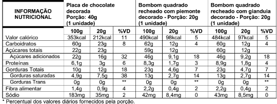 Bombom quadrado recheado com gianduia decorado (Bombom de chocolate ao leite com recheio de gianduia) - Ingredientes: Açúcar, massa de cacau, manteiga de cacau, açúcar demerara, leite desnatado em pó, leite em pó integral, gordura vegetal, chocolate 55% cacau, pasta de avelã, permeado de soro de leite em pó, aroma natural de baunilha, emulsificantes lecitina de soja (INS 322), estabilizante ésteres de ácido ricinoléico interesterificado como poliglicerol (INS 476), corantes artificiais vermelho 40 (INS129), tartrazina (INS102), dióxido de titânio (INS171), amarelo crepúsculo (INS110), azul brilhante FCF (INS133), óxido de ferro preto (INS171i), ponceau 4R (INS124), eritrosina (INS127), indigotina (INS132), metabissulfito de potássio (INS224), espessantes goma carragena (INS407) e goma jataí (INS 410), aromatizante. CONTEM GLÚTEN. CONTÉM LACTOSE. CONTÉM AÇÚCAR. ALÉRGICOS: CONTÉM DERIVADOS DE LEITE, SOJA, AVELÃ. PODE CONTER AMENDOIM, AMÊNDOA, CASTANHA-DE-CAJU, CASTANHA-DO-PARÁ, AVEIA, CEVADA, CENTEIO, TRIGO, OVOS, MACADÂMIAS, PISTACHES, PECÃS.