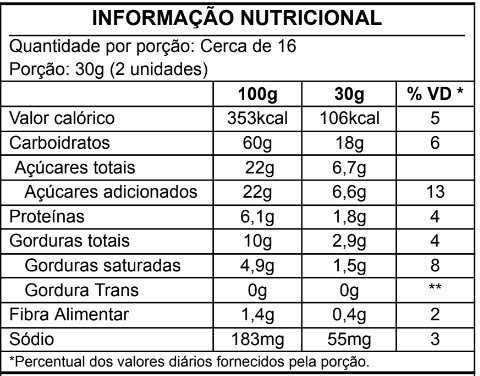 INGREDIENTES: Farinha de trigo enriquecida com ferro e ácido fólico, açúcar, ovo, açúcar cristal, manteiga, açúcar de confeiteiro (açúcar refinado finamente moído e amido de milho), açúcar impalpável (açúcar, amido de milho e fécula de mandioca), clara de ovo, leite integral, margarina 80% lipídios (óleos e gorduras vegetais totalmente hidrogenadas e interesterificadas, água, sal hipossódico, creme de leite, emulsificante: mono e diglicerídeos de ácidos graxos, lecitina de soja e poliglicerol polirricinoleato, conservantes: sorbato de potássio, acidulante: ácido cítrico, aromatizante: aroma idêntico ao natural, antioxidantes: TBHQ e EDTA cálcico dissódico, corantes: urucum e cúrcuma, Bacillus thuringiensis, Streptomyces vitidochromogenes e Agrobacterium tumefaciens), amido de milho, sal amoníaco, açúcar de baunilha (açúcar e aromatizante), vinagre de álcool (fermentado acético de álcool e conservante INS224), sal, essência de baunilha (água vanilina e corante caramelo IV), corantes artificiais vermelho 40 (INS129), tartrazina (INS102), dióxido de titânio (INS171), amarelo crepúsculo (INS110), azul brilhante FCF (INS133), óxido de ferro preto (INS171i), ponceau 4R (INS124), eritrosina (INS127), indigotina (INS132), metabissulfito de potássio (INS224), espessantes goma carragena (INS407) e goma jataí (INS 410). CONTÉM GLÚTEN. CONTÉM LACTOSE. ALÉRGICOS: CONTÉM OVO, DERIVADOS LEITE E DE SOJA.
