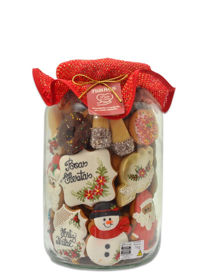 Spritz decorado (Biscoito amanteigado) – Ingredientes: Farinha de trigo enriquecida com ferro e ácido fólico, açúcar, manteiga, ovo, gordura vegetal (óleo de palma, óleo de soja*, estearina de palma e antioxidante: buti-hidroxitolueno BHT (INS 321), amido de milho*, fécula de mandioca, açúcar baunilha (açúcar e aroma de baunilha. "Aromatizado artificialmente"), sal, essência de baunilha (base aromática artificial de baunilha diluída em água e álcool etílico neutro), e fermento químico bicarbonato de amônio (INS 503ii). Ingredientes da cobertura: açúcar colorido (açúcar e corante artificial amarelo (tartrazina e amarelo crepúsculo FCF) ou azul (azul brilhante FCF) ou rosa (corante artificial eritrosina) ou verde (tartrazina e azul brilhante FCF) ou vermelho (vermelho 40 e eritrosina)), miçanga colorida (açúcar, amido de milho*, amido modificado, glucose de milho, antiumectante carbonato de cálcio, glaceante cera de carnaúba e corantes artificiais vermelho 40, tartrazina e azul brilhante FCF) e glacê (açúcar, clara de ovo, vinagre e açúcar baunilha (açúcar e aroma de baunilha. "Aromatizado artificialmente")). *Geneticamente modificados a partir do Agrobacterium tumefaciens e/ou Bacillus thuringiensis e/ou Delftia acidovoran e/ou Stenotrophomonas maltophilia e /ou Sphingobium herbicidovorans e/ou Streptomyces viridochromogenes e/ou Zea mays. CONTÉM GLUTEN. CONTÉM LACTOSE. ALÉRGICOS: CONTEM TRIGO, OVOS, DERIVADOS DA SOJA E DO LEITE. PODE CONTER CENTEIO, CEVADA, AVEIA, AMENDOIM, SOJA, LEITE, AMÊNDOA, AVELÃS, CASTANHA-DE-CAJU, CASTANHA-DO-PARA, NOZES, PECÃS E CASTANHAS.