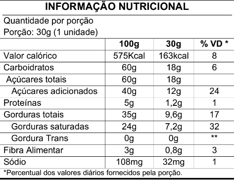 INGREDIENTES: Açúcar, massa de cacau, manteiga de cacau, açúcar demerara, gordura vegetal, leite em pó integral, leite desnatado em pó, permeado de soro de leite em pó, farinha de trigo enriquecida com ferro e ácido fólico, gordura de palma, cacau em pó, sal, aroma natural de baunilha, emulsificantes lecitina de soja (INS 322), fermentos químicos pirifosfato ácido de sódio, bicarbonato de sódio, corante caramelo IV, estabilizante ésteres de ácido ricinoléico interesterificado como poliglicerol (INS 476), citrato de sódio, regulador de acidez ácido málico, aromatizante. CONTEM GLÚTEN. CONTÉM LACTOSE. CONTÉM AÇÚCAR. ALÉRGICOS: CONTÉM DERIVADOS DE LEITE, SOJA E TRIGO. PODE CONTER LEITE. PODE CONTER AMENDOIM, AMÊNDOA, AVEIA, CASTANHA-DE-CAJU, CASTANHA-DO-PARÁ, CENTEIO, AVELÃ, MACADÂMIA, PISTACHE, NOZES, CEVADA.